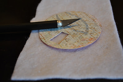 - set the scrapbook paper on the felt [to keep from scraping the table] and cut AROUND [not on] the shape you traced [it needs to be a bit bigger than what you traced or it wont fit]